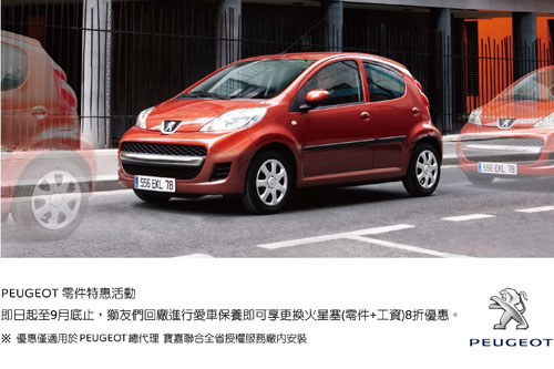 2010年PEUGEOT SERVICES原廠零件優惠活動第三波精選 ─ 火星塞組合,活動期間8月1日至9月30日止,獅友們回原廠保養除可享更換火星塞(零件+工資)8折更可享多款化學品加碼超值優惠。