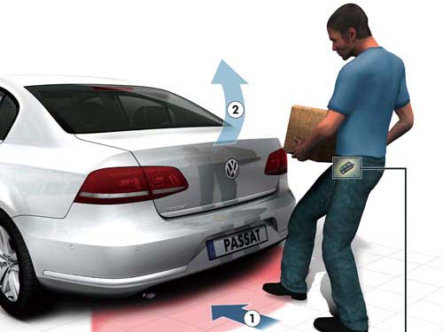 Passat車上最有趣的配備莫過於Easy Open行李廂開啟系統,在配備Keyless Access的車上,攜帶鑰匙的駕駛人無需像過去按壓遙控鑰匙的按鈕,僅需靠近車尾,並把腳伸向行李廂下方的空間搖晃,當車輛感應到駕駛人做出此一動作時,行李廂即會自動開啟,雖然看來像是愚人節的玩笑話,但在兩手抱滿物品時,此一設計可說是相當貼心。