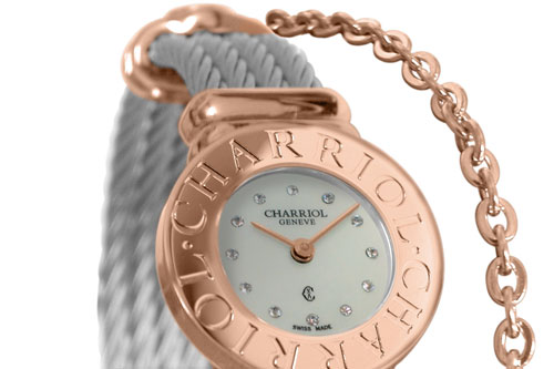 全新St. Tropez Mini鋼索腕錶系列為原有的St. Tropez系列增添了濃濃的法式浪漫情懷的同時,也保留著它的傳統設計概念。直徑20毫米的錶身配以經典幻彩白色珍珠貝母、時尚黑色或充滿陽光氣息的古銅的錶圈及錶面,時尚脫俗。嬌小的錶圈以品牌名字CHARRIOL或羅馬數字及時刻作修飾,表現別具一格的時尚優閒的味道。