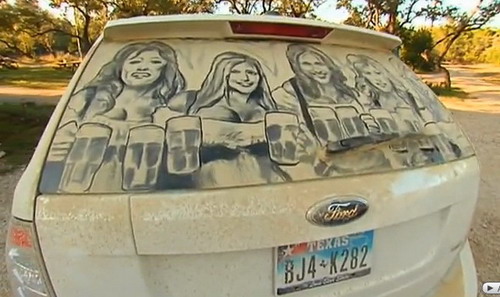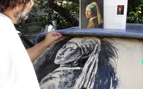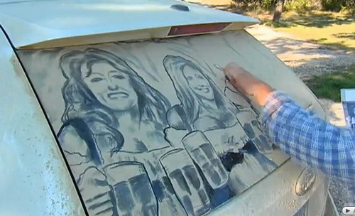 所謂「髒車藝術」,顧名思義就是在很髒的車子上進行藝術創作,不過這可不是在車身上進行潑墨或彩繪的動作,而是利用堆積在擋風玻璃上的厚厚灰塵進行繪畫創作,而成為一幅幅美麗的畫作,使一輛原本滿佈灰塵的髒車子,變成另類的移動藝術作品,當然啦,附帶的好處就是不用再洗車了!