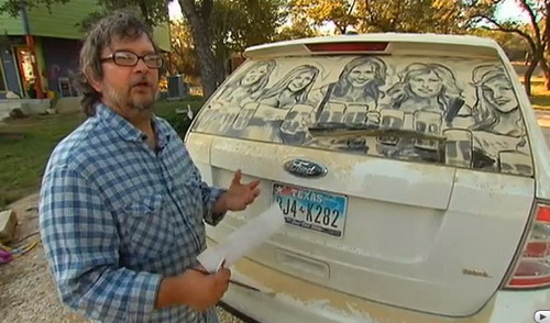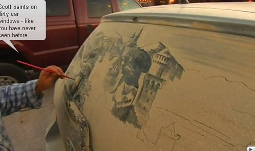 這位專門玩「髒車藝術」的藝術家,是一位住在美國聖馬科斯的Scott Wade,他原本就是一位從事藝術畫作教學的傳授老師,而之所以激發出「髒車藝術」這項創作靈感,主要是因為常看見灰塵滿佈的車輛擋風玻璃上,經常被畫上或書寫些不雅的文字與圖案,因此他靈機一動,拿起畫筆,利用堆積在灰塵開始進行揮毫,將美麗的人物或景觀圖像給烙印在擋風玻璃上。