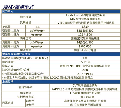 國內將販售的日本原裝進口Honda INSIGHT Hybrid配備有含CVT無段變速系統(七速模擬)、Paddle Shift換檔快撥鍵、六氣囊與VSA車身動態穩定控制系統,光感應自動頭燈及雨滴感應自動雨刷、恆溫空調系統、方向盤音響快撥鍵與定速巡航等,精緻高質感的豐富安全配備。外觀車色有「珊瑚藍」、「珍珠白」與「黑鈦銀」三種選擇。