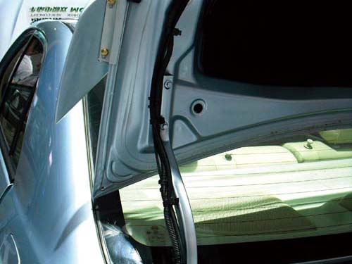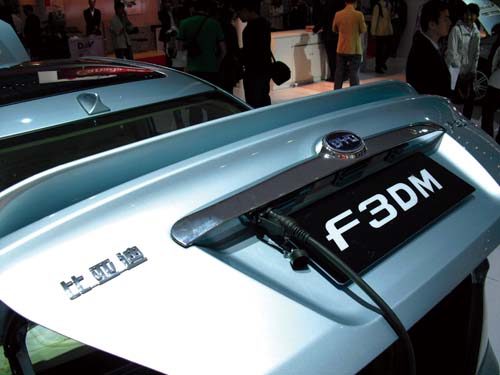 | 號稱EV續航力可達100km、氣勢如日中天的「F3DM,雙模電動車」依然不見其在深圳街頭奔馳!但其後增添的「Plug-in」功能似乎是新設計,但沿著行李廂蓋支桿固定的充電線完全沒有強化絕緣措施,令人看了膽戰心驚。 |