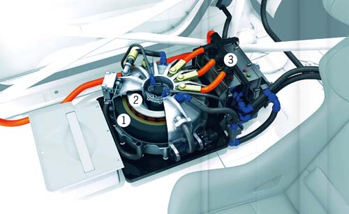 | 飛輪質量電池與電力供應元件佔去了所有副手座的空間,難免增加車重,飛輪質量電池的外觀倒是與方舟反應爐有些相似 。 |