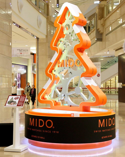 繽紛12月,快來迎接一個不一樣的橘色耶誕!美度表以「匠心獨運 永恆經典」為設計主軸,精心打造3公尺高2.4公尺寬的聖誔樹,高聳樹立於台北101購物中心內,營造暖暖的橘色耶誕節!有別於傳統的聖誕樹,瑞士品牌MIDO美度表運用原創性與大膽創新精神,以聖誕樹輪廓為造型的橘色緞帶設計勾勒出鮮明形象,緞帶內的機芯齒輪設計象徵MIDO美度表的專業鐘錶工藝精神,並與圓形的立體錶盤造型底座相呼應,完美呈現美度表的品牌精神,一身橘色緞帶衣的MIDO美度表聖誕樹,搭配掩映於樹梢間的銀白雪花,MIDO美度表橘色聖誕樹要帶給所有消費者永恆時間的完美紀錄,刻劃每一刻幸福時光。