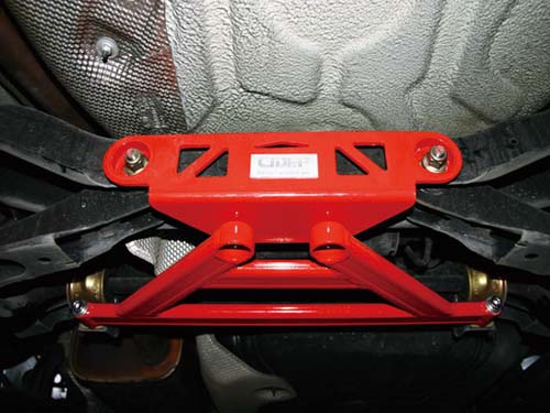由於Foucs是屬於前輪驅動的設計,因此後輪的循跡性也盡量設定得偏向喜美般滑溜,不過因為是三廂所以車輛後半部的底盤硬度提昇也就是重點之一,使用下四點式拉桿及下結構桿能夠將車尾牢牢的強化。另外為了能夠提昇後輪反應,魚眼後下支臂及後防傾桿都是不可缺少的配置,而防傾桿李仔串位置的後移,也是令後輪反應更加靈敏的小秘方