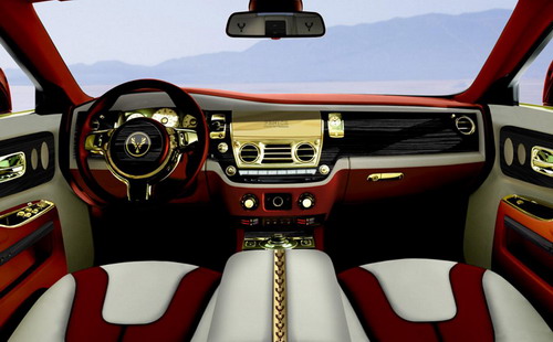 這款金光閃閃的Rolls Royce Ghost特仕車,在外觀上則提供了包括海軍藍、古青銅與珠光白等三種車色,且皆採用雙色塗裝處理。而白色版本車型被稱為「金手指之夢」,整個外觀極度雍容華貴;但若覺得金手指之夢過於「華而不實」的話,那就可以選擇海軍藍車型,其水箱護罩是鍍鉻的,且擁有泛著珍珠光芒的白金塗裝。另外,青銅色塗裝車型與白色車型有著同樣的24K金水箱罩、引擎蓋,整車則散發出一絲黃金與青銅交相輝映的皇室色彩。