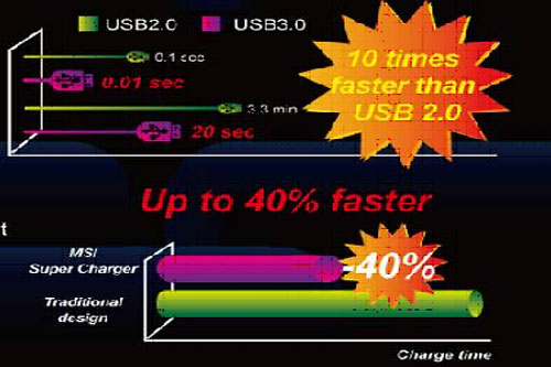 生活要便利,傳輸要有力。CES展示2011年全新機種,均搭載2個高速的USB 3.0。USB 3.0可提供約5Gbps的傳輸速度,約為USB 2.0 的十倍,可說是現今市面上最快速的傳輸介面。透過USB 3.0可讓使用者享受更快速的高解析度資料傳輸,例如一部4.8G高畫質電影檔案,只要14秒鐘就可以完成傳輸,十倍的傳輸效率彷彿一天省下2.4小時,讓生活更有效率,傳輸更為簡便。另外MSI運用了Super Charger技術,讓USB充電的裝置不僅可以透過其中一個USB 3.0進行,甚至在關機時也能充電,而充電時間透過更可以減少40%,使用者在忙碌的生活中再也不需要為了充電而開啟電腦,大大增加了生活的便利性。