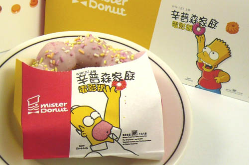 風行美國 17 年的卡通「辛普森家庭」電影版即將在 2007 年 8 月 10 日與全台觀眾見面,而為將辛普森家庭中的甜甜圈與真實商品結合,台灣福斯電影也主動與 Mister Donut 接觸,由 Mister Donut 為該電影量身打造「辛普森歡喜」系列,外型上採用草莓巧克力醬,並灑上彩色糖顆粒,具傳統美式風格,除「辛普森歡喜」系列外,Mister Donut 還特別將辛普森家庭中的爸爸「荷馬」及大兒子「霸子」肖像運用在甜甜圈包裝及提袋上,讓辛普森家庭的歡樂氣氛充滿 Mister Donut 門市。Mister Donut 辛普森歡喜系列將於 7 月 25 日同步上市,辛普森家庭的粉絲千萬不要錯過。