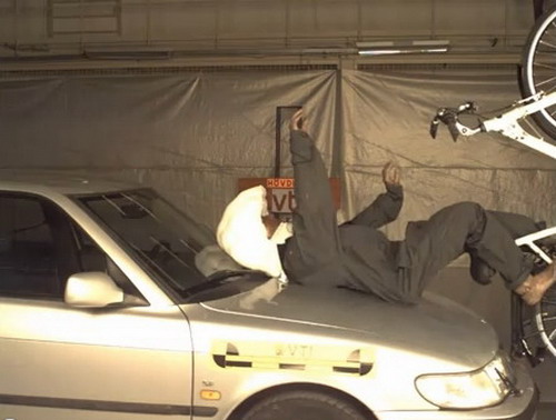 | 遭汽車追撞時,頭部往往會大力撞擊前擋或引擎蓋。 |