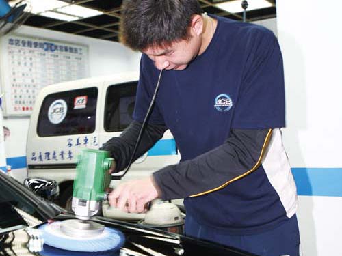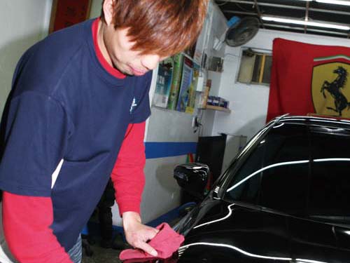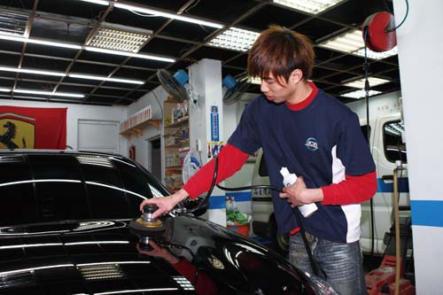 | 美容步驟二推蠟:上完蠟之後便可使用蠟布將蠟均勻的推開,當漆面漸漸光亮之後必須放輕力道以免造成二次刮痕,接著再反覆上述步驟直到 表面呈現光亮無痕的光澤即可。 |