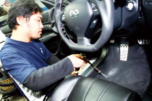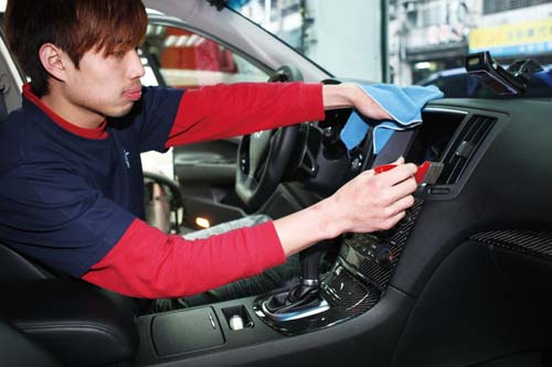 | 美容步驟六中控台清潔;中控台的按鍵、面板很多,因此清潔方式必須以風槍及毛刷處理,除去灰塵之後可以使用專用的內裝蠟來進行保養。 |