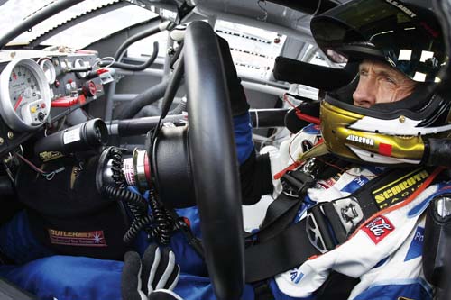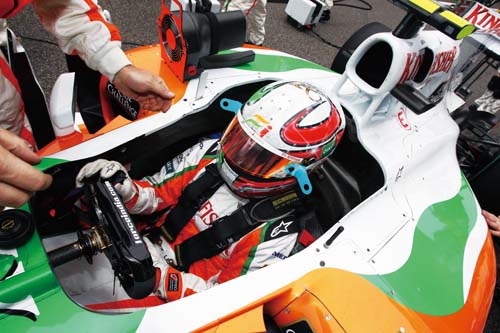 | 從這張筆者拍攝的照片中也可清楚看出HANS作用方式,確實是透過控制安全帽向前擺動的幅度,來減少車手頭頸部的傷害。 |