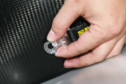 | 有些新款安全帽上也設有連接滑動固定帶的鋁合金釦帽,使用時只要將滑動固定帶末端的金屬扣環,壓入釦帽內然後向後拉即可完全固定。 |