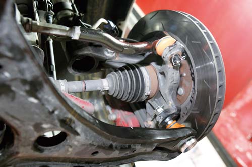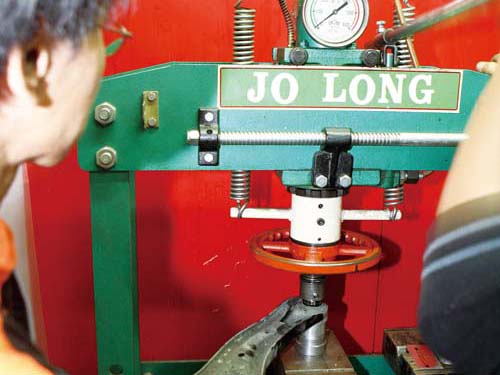 接著安裝SWAVE補正和尚頭與方向舵桿,由於前三角架下方的和尚頭必須使用油壓床逼出,因此必須將整個下三角架拆下來施工,換上較長的SWAVE補正和尚頭,而相較之下更換方向舵桿就簡單許多,只需拆下原廠品換上SWAVE補正方向舵桿即可,整個施工過程大約一個小時內即可搞定。但是在裝上下三角架時卻出現了一個問題,那就是此車煞車碟盤直徑達338mm、厚度28mm,換上SWAVE補正和尚頭之後轉向時碟盤就會掃到三角架的最外側,後來經過修改之後便順利安裝上去,由於之前測試車輛使用原廠直徑280mm、厚25mm的煞車碟盤,並沒有發生過這個問題,因此建議使用直徑330mm以內的加大碟就不會發生這種狀況。