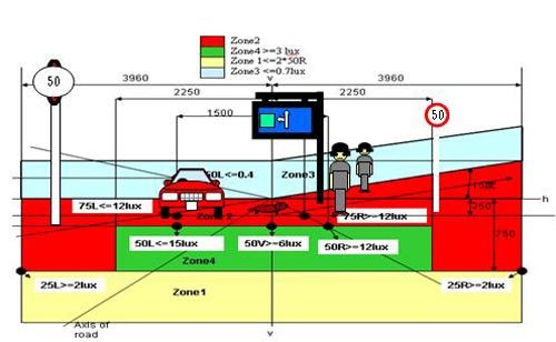 根據德國聯邦統計局(Federal Statistics Office)所研究的資料,日夜車禍發生比率為6:4,但夜晚的車流量僅是白天的五分之一,換算起來夜晚開車肇事的機率可是白天的三倍多,可見夜間駕車有多危險!夜間駕車的事故發生率之所以偏高,究其原因,視線不良占相當大的比重,而視線的維持,除了靠一般道路兩旁的夜間照明設施外,更重要的還是需要車上的照明燈具,而頭燈是夜間提供駕駛者良好視線最重要的照明系統。其應能提供駕駛者足夠的亮度、範圍,使駕駛得以辨識道路環境的狀況,看得到行人、車輛、路標或其他障礙物;此外在設計時也應考量到,如何避免光線照射到對向來車駕駛者的眼睛而造成眩光現象。以圖1為例,一個符合歐洲法規光度要求的頭燈,於其有效照明範圍內,可以清楚地辨別行人、道路障礙物、路標等道路環境,並避免車燈光線直射對向來車,而此處所指的頭燈有效照明範圍,一般通稱為光型。