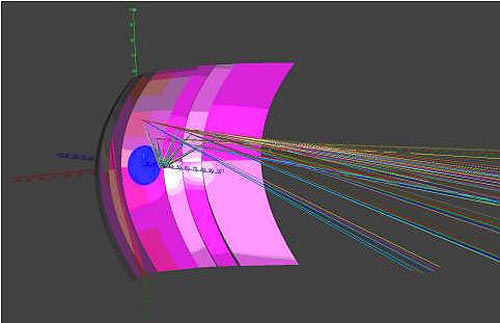 而汽機車頭燈要如何設計出正確的光型呢?整體來說,應需考量到使用的光源(如鹵素燈泡、HID、LED等)、燈殼(透鏡)以及反射鏡,利用光學原理中的折射、反射定律,藉由工程繪圖軟體及光學設計模擬軟體交互運用,來達到各種法規或標準所規定的頭燈光型分佈。設計完成並經由電腦軟體模擬驗證光型,只能算完成一半,後續的模具加工製造、塑膠射出、電鍍等工作階段,每一步都與最終的成品性能息息相關。無論如何,最後的成品都必須實際進行配光驗證,符合法規或更高標準的要求。圖3及圖4為運用工程繪圖軟體及光學模擬設計軟體,所設計之頭燈反射鏡及其光學模擬範例。