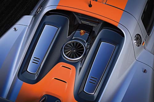 另一個讓車迷感動的部位則是位於車身後段、引擎上方的外露式風扇,此一大型風扇在過去氣冷Porsche車款上乃是散熱的必要配備,在進入水冷時代後,量產車已經不再使用此一設計;在918 RSR車上再度出現這項配備,可說是向經典致敬的安排;位於車身後段的大型固定式擾流翼,則是取材自RS Spyder,強化此車的賽車實驗室風味。