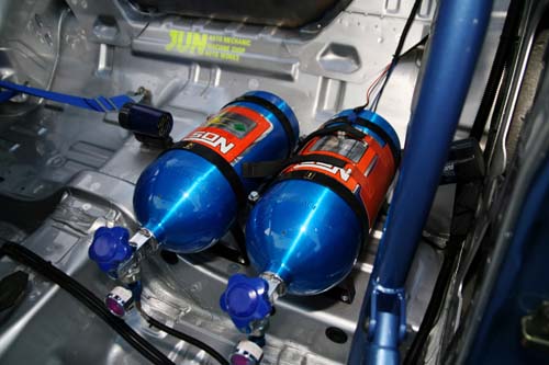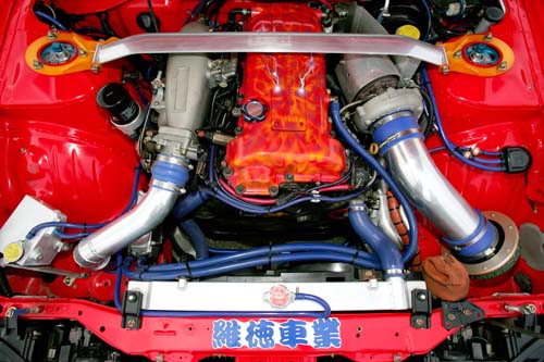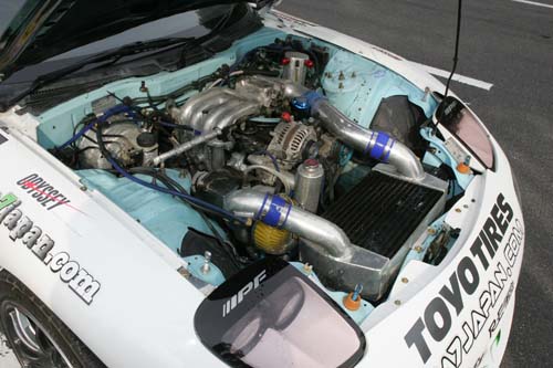 | 強烈的扭力及動力完全榨出,最強的六缸本體,現在D1最強的引擎可說是搭載上Supra等車種上的2JZ,也是D1當中最早將動力壓榨到800hp(588千瓦)的本體,以齊藤JZX100上的2JZ在換裝美製活塞、連桿及曲軸的組裝下,排氣量約可提昇至3.4L左右,因此扭力的攝取也變得更加容易,而2JZ最大的弱點就是高迴轉區域,不過在交換其它車種的氣門挺桿後,8000rpm的高轉速化也成功達成,而T88-34D的低速扭力問題就由NOS來負責彌補 |