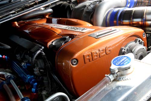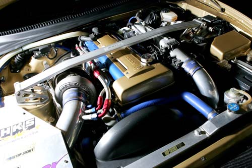 | 暢快的高迴轉速魅力六缸本體,D1 GP中使用RB25本體的車輛其實並不多,雖然只差了100c.c.但RB26及RB25的特性其實相當大,RB26原本就是針對賽車為前提開發的本體,因此動力的攝取相當容易,不過Blitz並沒有將車輛換上RB26,而是活用RB26上的可變機構來強化中低速的扭力,下半座部分則是沿用原本2.5L缸體,在換裝腹內套件後將排氣量一舉拉大至2.8L,如此一來對於馬力及扭力的提昇都有正面的幫助 |