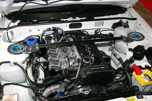 | 四缸1.6L基礎,自然進氣的異樣引擎,就算施以渦輪增壓,4A-G也是有一定的界限,畢竟僅有1.6升的排氣量,對於近年來高速化的D1 GP來說,4A-G在故意保持無增壓系統也有著特殊的意義。以日比野哲也的86來說採用AE111五汽門的4A-G為主體,在調整壓縮比及四喉直噴搭載下,高迴轉速的動力更是相當飽滿,另外UPGARAGE更藉由直噴管路的長短來改變扭力的輸出特性,而NOS部分則設定在油門開啟95%以上持續噴射,整體動力精華約5600~8800rpm |