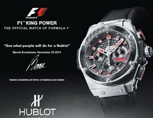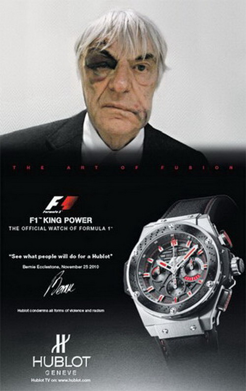 話說Bernie Ecclestone在遭歹徒搶劫時,硬是把他手上價值約30萬美金的名貴Hublot錶給搶走,同時也給Ecclestone一頓拳腳,讓他的臉青一塊、紫一塊,而這也激起了廣告公司的創意與想法。他們認為找Ecclestone這樣的富翁來代言昂貴的Hublot錶是很理所當然,但要如何進一步來突顯及呈現出Hublot錶的價值呢?因此廣告公司想到當時的搶劫過程,而有了這樣的想法─「如果歹徒搶劫只是為了Ecclestone手上的Hublot錶,或是Ecclestone因為不想Hublot錶被搶走而被揍」,如此Hublot錶的價值不就被突顯出來了嗎。因此廣告公司就在平面廣告上放了Ecclestone被揍完後的黑青模樣,然後再寫上「See what people will do for a Hublot」(看人們願意為Hublot付出什麼樣的代價!)這行字,而完成了最精采、最具創意與戲劇性的平面廣告!對此筆者也只能說,Bernie Ecclestone你真是好樣!