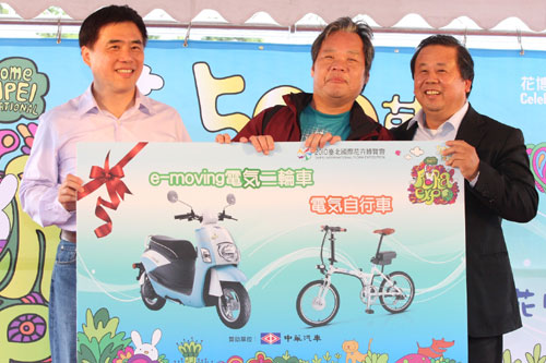 e-moving電気二輪車誕生於2010年,是以汽車造車工藝的高標準為顧客所打造的綠色代步工具;繼中華汽車為花博盛會量身訂做符合花博精神的警察專屬巡邏車,供警員在會場巡邏及公務使用後,完全幅合花博節能減碳環保主題、目前電動機車市占率第一的e-moving電気二輪車也獲花博青睞成為本次破五百萬人次最大獎項。為了拿到抽超級大獎「e-moving電気二輪車」及「e-moving電気小折」的幸運券,一早花博入口處就擠滿準備進入會場的民眾,最後終於在今天早上(9時5分)正式突破五百萬人,拿到幸運券的民眾馬上聚集到舞台區,深怕錯失中獎機車,最後由郝市長抽出一位幸運的遊客,遊客獲獎後笑的合不攏嘴,直呼太過癮了。