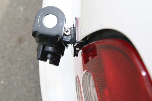 | 固定座鎖上去後還要注意會不會撞到後尾燈殼,如果會撞到除了換位置外,也可試著將圖中的擋片稍微向後扳,以免日後尾門開關下,發現尾燈怎麼破了。 |