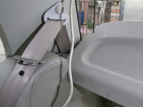| 將後座椅背放倒,把傳輸線藏到行李廂內,再找椅背與椅面間的縫隙來放置傳輸線,由於海綿稍微擠壓就會有空間出現,因此要將線藏到看不見相當容易。 |
