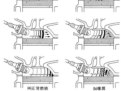 混合油氣在燃燒室經由火星塞點燃爆炸燃燒,並形成一個「球面火焰鋒」,從火星塞電極處逐漸向外擴散,如果此火焰鋒持續而穩定的傳至整個燃燒室,其傳播速度及火焰形狀沒有發生突然變化時,稱之為「正常燃燒」。在氣缸內的燃燒過程中,如果火焰傳播之速度發生突變,或火焰烽的形狀突變,則燃燒室中會產生「壓力波Pressure Wave」。氣缸內不正常的壓力波,與燃燒室四週的機件發生碰撞,使氣缸壁及活塞頂部發生震動,而發出類似金屬敲擊的聲音,此種氣象稱為爆震(Detonation)。當爆震嚴重時,會導致引擎無力耗油及過熱,且容易促使引擎機件快速的損壞!汽油引擎爆震之原因有:氣油辛烷值過低、燃燒室內局部單點過熱、引擎過熱;或是氣缸內部積碳過多、點火時間太早、混合氣太稀、混合氣溫度太高,有時候混合氣壓力太高以及引擎壓力比太高,都是造成的原因。