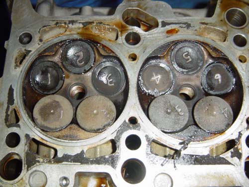 | 此為VAG集團中1.8T銘機的燃燒室圖,此引擎採先進的五氣門設計,上方三個為進氣門、下方兩個為排氣門,在氣門間可見到許多積碳,大大影響引擎的輸出效能。 |
