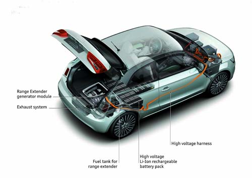 A1 e-tron是一款實驗性十分濃厚的概念車,但Audi並沒把這部車留在車展的高臺上,反而在去年陸續生產了20部A1 e-tron,並將這些車輛投入慕尼黑的電動車示範區內進行測試。A1 e-tron並非單純的Plug-in式電動車,充電插頭當然是這部車的標準配備,比較特別的設計是這部車裝上了一具排氣量極小的轉子引擎,這具轉子引擎安裝於行李廂下方,它並非用來提供動力,反而是專門負責發電提供給電動馬達使用。