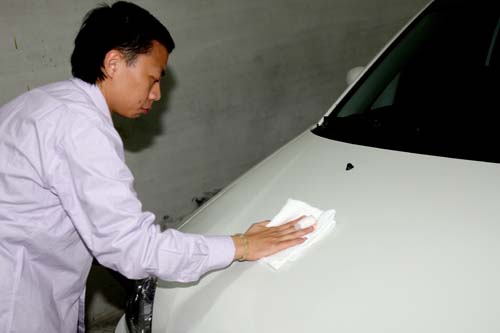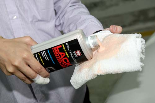 拜現今科技發展所賜,近期吸引力汽車材料公司自德國引進新一代汽車美容用品,該公司共計推出三款適用於車身、車內及前檔玻璃的車輛美容用品,其使用方式極為簡單,首先為各位讀者介紹車外美容用品使用方式,使用前請將車身外觀清洗並擦拭乾淨,接著將其頂級鍍膜以垂直或橫向方式均勻塗抹於車身,以筆者實際操作了解,使用過程盡量以小面積施做方式進行塗抹,藉此可使產品塗附效果加分,也可避免漏失沒有塗抹到的狀況發生,塗抹完成後約半小時過後,原先塗抹在車身外表的頂級鍍膜會漸漸轉變成白霧狀,此時以乾淨抹布再次擦拭車身外表即可。
