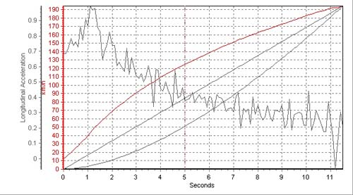 經過兩次測試,第一趟跑出11.72的成績,而第二趟就輕鬆的進步到11.50秒的水準,而筆者認為起步時輪胎有些微空轉的現象,若能克服這點秒數應該還會再進步一些,不過因為此車變速箱並未強化,為了保護變速箱所以僅以11.50秒的成績完成測試。