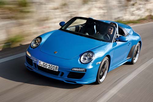 | 911 Speedster售價 201,682歐元限量 356部911 Speedster則是另一部在997車系中重生的經典車款,此車同樣採用了許多經典車款的造型元素,包括更傾斜的前擋、雙駝峰軟篷蓋、加寬的車身以及降低60mm的車身高度,1988年推出的第一代911 Speedster是為了讓買家能直接下場比賽所設計的車款,新一代車型則是為了慶祝Porsche Exclusive部門建立25週年的特別車型。 |