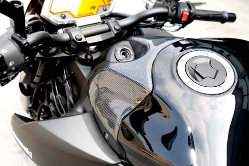 | 訂製品的密合度與質感真的相當不錯,這裡的油箱前護蓋筆者還以為是原廠就搭配碳纖維套件,但事實上這也是訂製品之一。 |