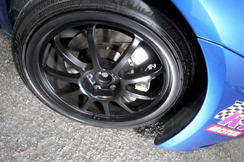 | 此車前輪煞車卡鉗是以AP六活塞卡鉗是以鋁合金鑄造搭配不銹鋼活塞製成,使用特製345mmm碟盤,與Neuspeed 19吋輪圈形成強烈殺氣。 |