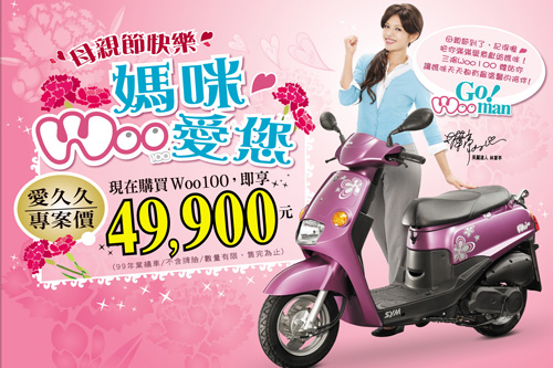Woo100美麗騎機,選在母親節這個特殊的日子推出特別優惠活動,現在買Woo100美麗騎機只要$49,900,給媽媽最美麗的支持,讓媽媽們為自己創造人生美麗奇蹟,就像美麗達人林葉亭一樣,展現獨立,走自己的路,開創屬於女人自己的美麗人生。Woo100母親節特專專案,限99年業績車不含牌險。