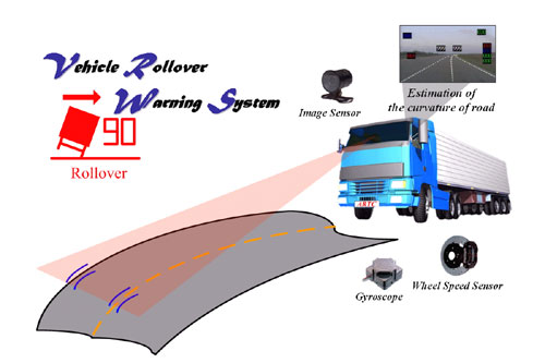 一般車輛都利用車輛動態穩定系統(ESP)或是GPS定位訊號等方式來避免車輛失控、側滑或翻覆,但如能提前預警駕駛人即將達到翻覆臨界車速,即可大幅降低事故的發生率,因此車輛中心利用影像辨識技術研發出車輛翻覆警示系統,可偵測到車前方50公尺的車道線曲率,並結合車速等參數來預測翻覆指標,提示翻覆的臨界車速,警示駕駛人減速,達到預防翻覆的危險。若以車速80km/h來計算大約能夠搶先在2.25秒前預知車輛可能會發生翻覆危險,所以能「提早」警告駕駛人注意,藉以避免事故發生,而且此系統也能安裝於各類車型上。