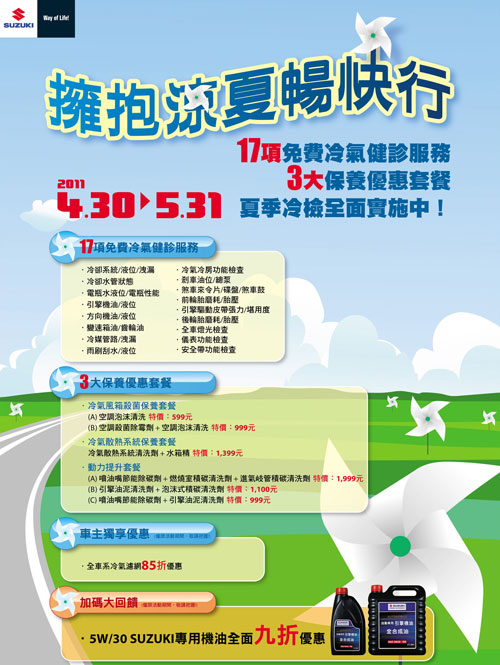 為了迎接酷熱的夏季到來,TAIWAN SUZUKI貼心提醒各位車主朋友們應提前為愛車做好完善的車況冷氣健康檢查,自2011/4/30起至2011/5/31止,SUZUKI將於全省經銷商服務廠舉辦「2011年SUZUKI擁抱涼夏健診活動」,邀請所有SUZUKI車主開心回娘家。針對夏季的高溫氣候,特別提供了17項周全且貼心的免費車況冷氣健診服務以及3大保養優惠套餐。除此之外,SUZUKI為回饋所有車主長期的支持與愛護,活動期間更備有精美好禮-除塵手套與多項車主獨享優惠方案,歡迎各位車主把握機會,為您的愛車進行健康檢查與清潔保養,共同擁抱暢快沁涼的熱情夏日!為節省現場等候時間,建議車主可先行預約回廠時間,詳細情形請直接撥打SUZUKI洽詢專線0800-098-345或至SUZUKI全省各大經銷點洽詢。