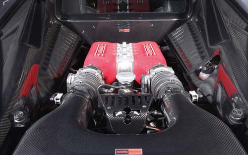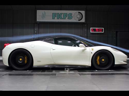 | 藉由風洞測試所設計出的458 Italia專用碳纖維前下擾流、側翼、引擎進氣孔道、車頂、引擎蓋、葉子板、側裙、後視鏡、尾翼與後下分流器等部件,提供了效果更為明顯的空力效應,至於動力輸出則稍微提昇到600hp/55.04kgm的水準。 |