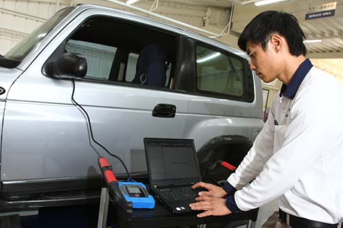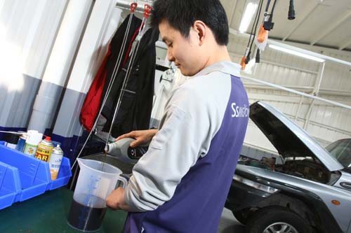 | 專業貼心的維修技師以原廠電腦檢修進廠車輛,甚至用量杯詳實確認機油量,精確為車輛添加機油。 |