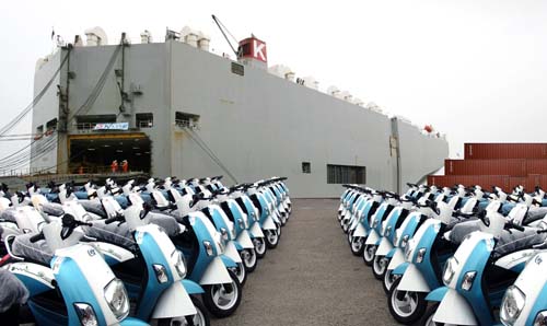 | 首批外銷的「e-moving電氣二輪車」數量共有300輛,官方新聞稿的圖片背景正是最夯的新景點-「汽車運輸船」。 |