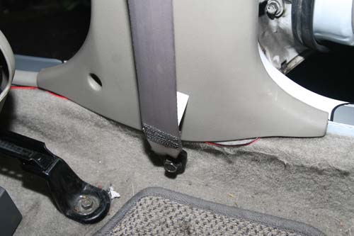 | 電源線則需向前拉至中控檯下方,因此須經過B柱飾板,原則上不需要拆除B柱飾板,只要將電線藏在其下方內側就可達成 |