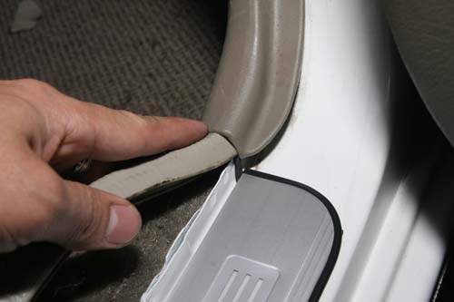 | 將後門檻膠條裝回車門板金接縫上,將其塞入B柱飾板內時,記得要注意不能卡到冷光飾板的電線,否則一用力塞電線可能因此拉斷,一組產品就此報銷。 |