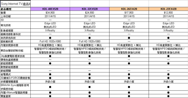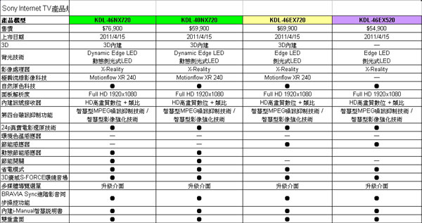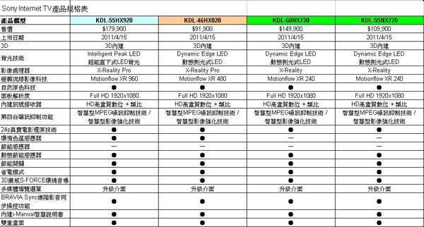 全新Sony Internet TV共七個系列17款,透過網路連結與BRAVIA Internet Video網路影音平台,不僅可以觀賞網路上的各類影片、查詢播放內容,甚至可以透過Skype進行視訊電話,連繫親友情感。高階機種透過新一代X-Reality Pro影像處理晶片、超能直下式LED背光技術、OptiContrast優效對比極致面板、及Motionflow XR960極瞬流線影像科技,帶來細膩流暢且生動鮮明的Full HD 2D與3D高畫質影像,而外型則承襲黑彩藝晶一體成型的設計再進化,讓電視無論於開機或關機時,都是家居擺設的完美焦點。此外,全新的媒體遙控功能、多功使用者介面、與智慧型節能感應功能,帶來更直覺簡便的操作,讓使用者輕鬆進入未來式的影音娛樂世界。