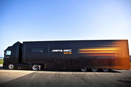 | McLaren使用專屬塗裝的拖車來運送MP4-12C GP3。 |