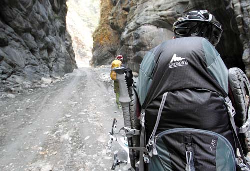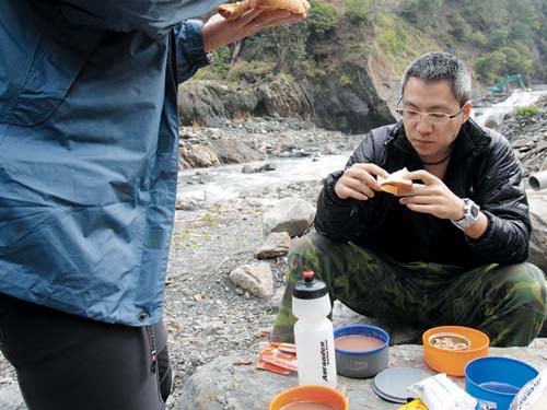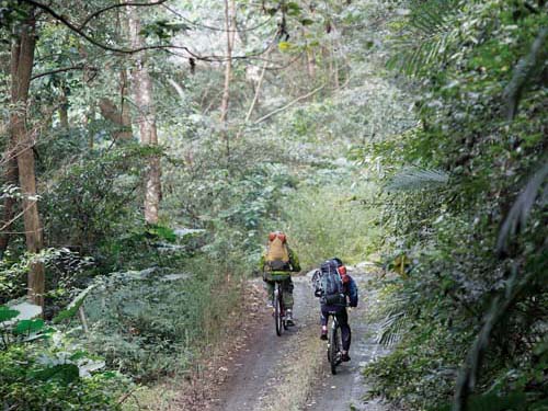利用單車座椅的高度我們架起了天幕,鋪好地布與睡袋之後就這樣睡在溪谷之中,夜裡遇見當地的原住民獵人好奇的前來關心為何有人在這溪谷中生火過夜,他們說這裡有時會有熊出沒,雖不一定是真的,但可以肯定這一帶山區的自然資源還算豐富,不然也不會進來溪谷中打獵了。