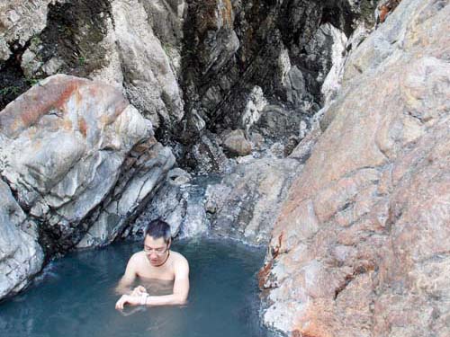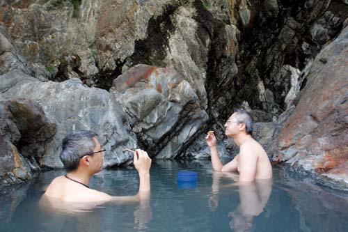 這裡的溫泉露頭不只一處,但泉質相當清澈、溫度在攝氏40到50度,屬弱鹼性的碳酸泉,暗夜之中不會有其他閒雜人等來打擾,大可衣物全脫裸泡也無所謂。