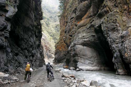 北港溪的上游溪谷真可算是大自然的地質教室,多的是巨石嶙峋的景觀,岩壁的紋理有如油畫,部分溪段的二岸有超高聳的山壁,顯得溪床相當狹窄,騎乘在溪床便道上的騎士就更顯渺小。
